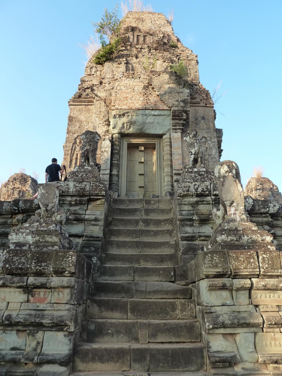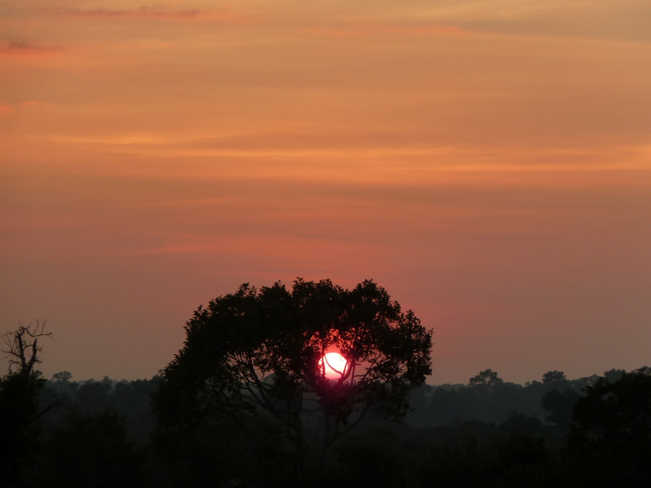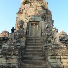 ここから見る夕陽は本当に綺麗でした。木々の間に沈んでゆきます。高い遺跡は階段がたくさんあり、1つ1つの段が結構高いのでよじ登った感じです。上は広いテラスのようになっていますが、人が多く密度は濃かったです。:日没。だんだんと茜色に染まる空。夕陽が完全に沈むと自然と拍手が巻き起こりました。その後まだ夕焼けが続きますが、しばらくするとあたりが暗くなります。暗くなってしまうと階段が急なので結構危険です。ある程度で帰られた方がいいと思います。