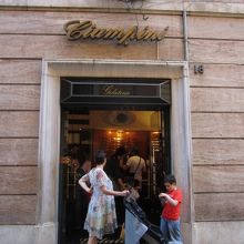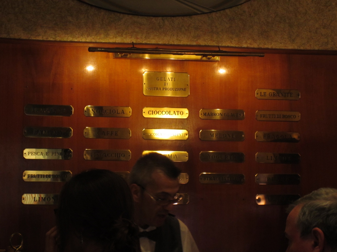 普通の店のようにジェラートはむき出しになっておらず、容器は蓋をされています。ちょっと高級な感じがします。店員さんの背後にあるプレートに書いてあるジェラートの種類を見て注文する仕組みです。