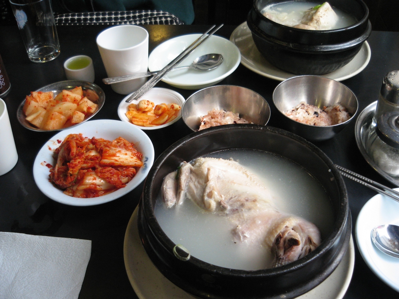 サムゲタンもいろいろ食べてみたが、さすが33年の歴史があるだけに、こだわりを持っているらしく内容も充実して美味しい物で病みつきになる。サムゲタンとは若鶏のお腹に餅米、朝鮮人参、棗、にんにく、栗など詰めてスープで煮込んだボリュームたっぷり、栄養たっぷりのヘルシー料理である。体が温まるので冬の物と思っていたが、韓国では夏ばて予防に夏によく食べるといわれている。