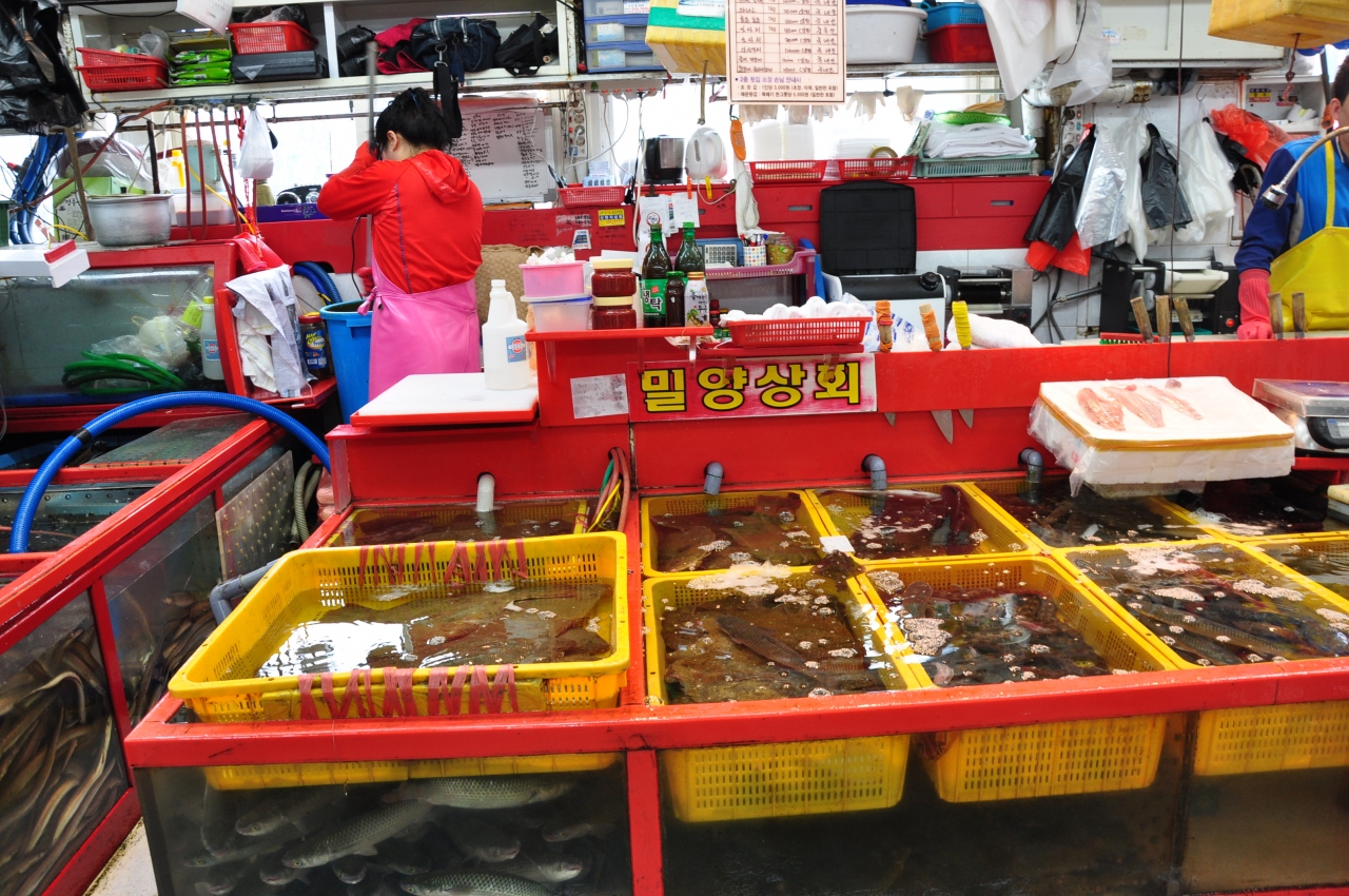 釜山へ行ってあまり時間もなかったので有名?な市場へ行ってきました。釜山は日本人が多いせいか日本語も話す人が多かったです。魚もたくさんあり見てるだけで楽しかったです。一度は見てみるのもいいと思います。そこで魚を食べてのんびりするのをお勧めします。