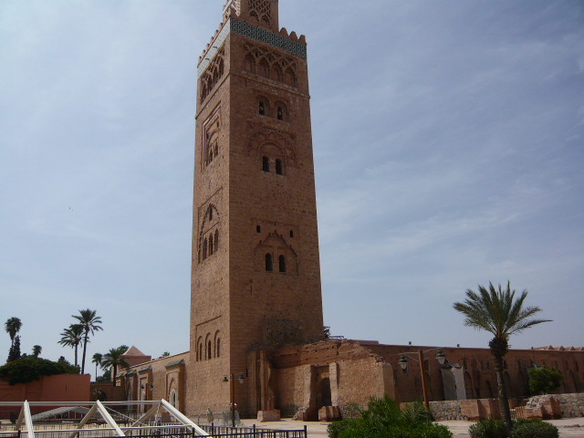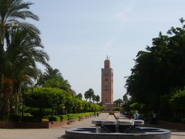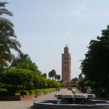 フナ広場から南に見える高い建物がクトゥビヤのミナレットです。フナ広場から10分も歩けば着きます。中に入ることは出来ず、外から眺めるのみのため、観光客はまばらでした。ミナレットの東側には綺麗な公園があり、その公園からはミナレットの全景がよく見えました。