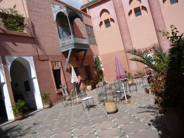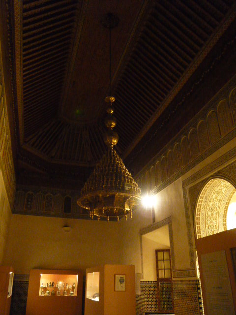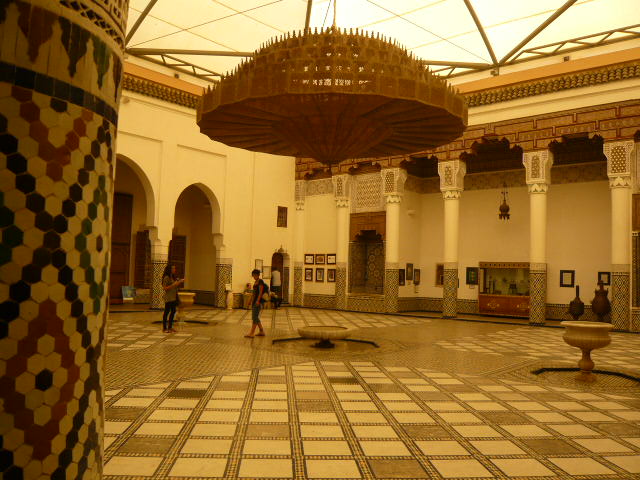 フナ広場からスークを抜けて北へ進んだ場所にある博物館。入口近くにはオープンカフェがありました。建物を入ると、中央にとても広いパティオ。大きなシャンデリアがぶらさがり、細かい彫刻がありました。パティオの周りにある小部屋には展示物が飾られてましたが、節電中なのか室内は薄暗く、よく見えなかったのが残念でした。