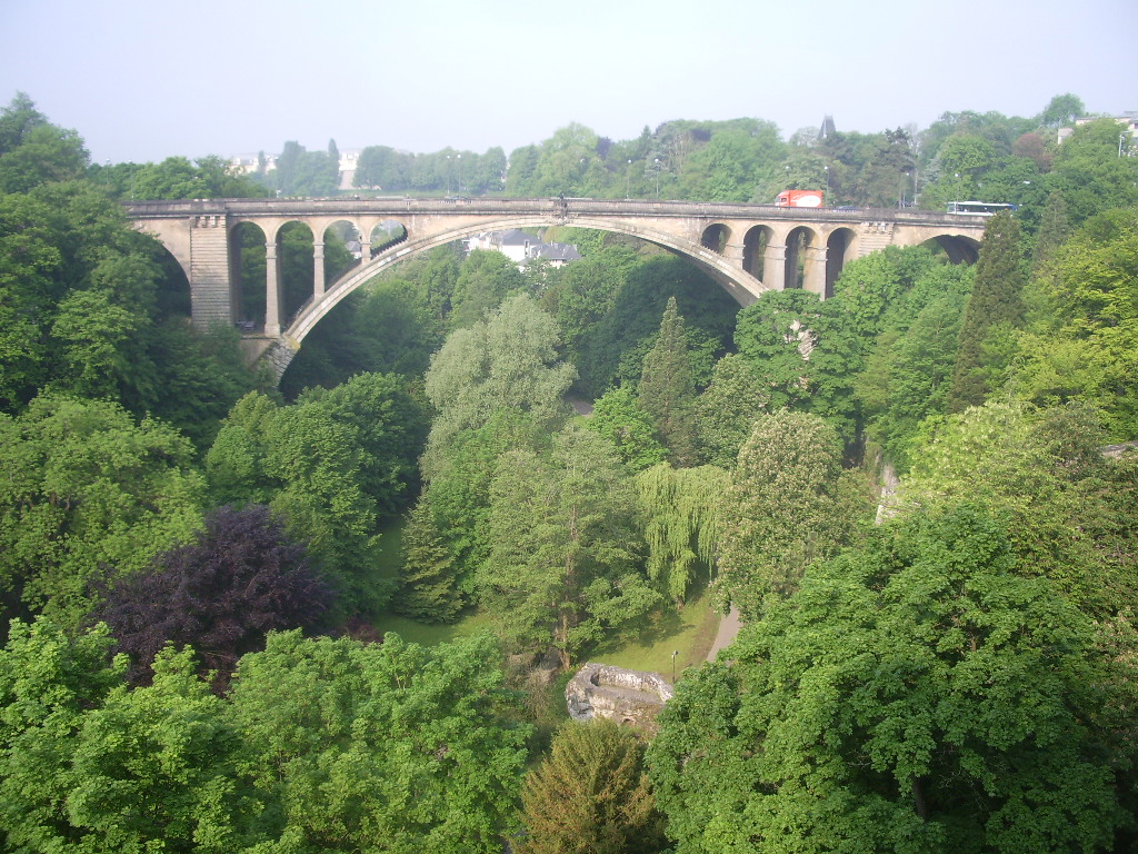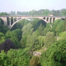 駅から真っ直ぐに20分も歩くと高架橋に到着。視線を上にするとルクセンブルグの国旗がたなびき、下を見ると緑の谷間の絶景が広がります。是非とも、この橋の下の谷間を歩きたくなることうけあいです。土産物屋さんも、ジュース・スタンドも何もない、ただただ緑の広い谷間が広がっています。谷へ降りるには橋を渡って左に10メートル行くと細い下り道があります。