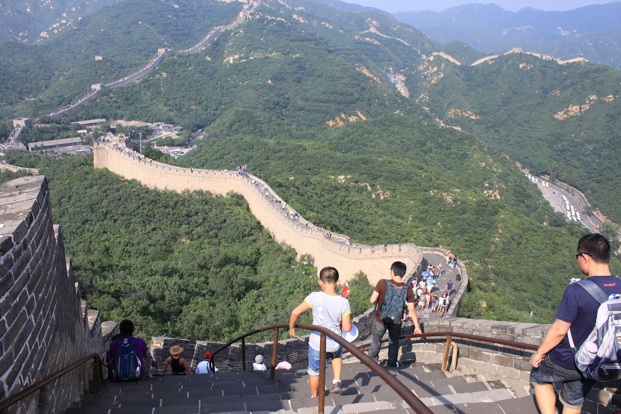 万里の長城は2回目で以前は比較的なだらかな女坂に行きましたが、今回は逆方向の男坂にチャレンジしました。男坂はその名の通り、坂が急できつく、最も急坂なところは階段になっており、手すりにつかまらなければとても登れないようなところでしたが、何とか南四廊まで到着しました。ここから眺める景色は絶景で、万里の長城の規模のすごさを思い知らされました。男坂は坂がきついせいで観光客が比較的少なく体力の自信のある方は是非とも挑戦してみてください。特に南四廊からの景色は絶景です。万里の長城の大きさに感動します。