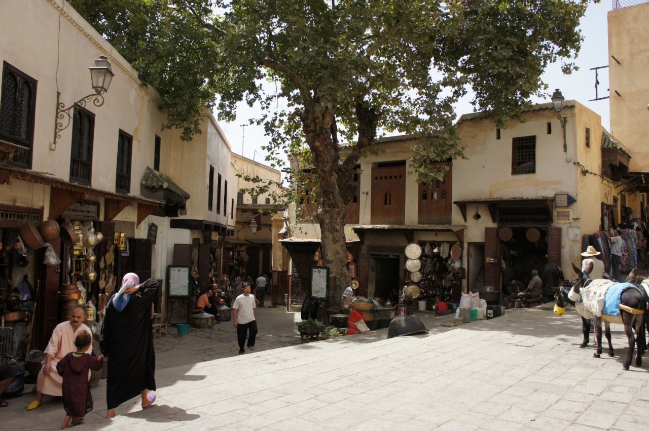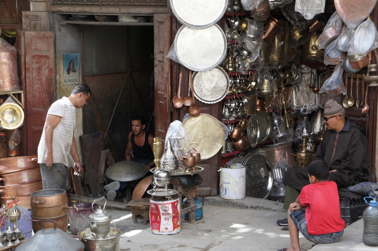 フェズの街で案の定迷子になっている最中、たどり着いた「鍛冶屋の広場」。ここは、フェズの日常が見えるローカルエリア。広場には、運搬用のろばさんが数頭待機していました。重さのある金属製品を運ぶのに、ろばさんが使われるのでしょう。広場には、職人さんの叩くトンカチの「カカン」「トントン」「カカン」「トントン」というリズミカルな音が聞こえて来ます。モロカンランプやポット、おぼんなどが売られています。