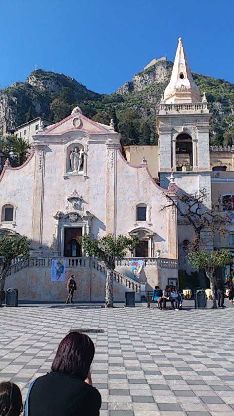 景色は素晴らしいです。写真は海側でなく山側の教会ですが、ベンチもありボーと過ごすのに最適です。昼食はリストランテタオルミーナで取りました。ここも景色が最高で、休憩時間なしで開いているので利用しやすいです。