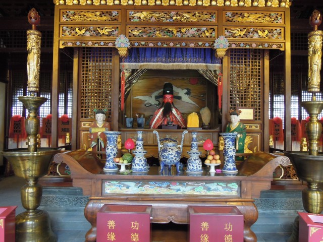 豫園の中の庭園に比べたら狭い場所ですが、多くの守り神がまつられ観光客やお参りの地元の人々でにぎわっていました。ここの守り神はお寺にあるような歴史を感じさせる仏像ではなく地元の人々に信仰されている道教寺院だそうです。豫園を見たついでといっては怒られますが、面白いお寺だと思いますので一見の価値ありです。