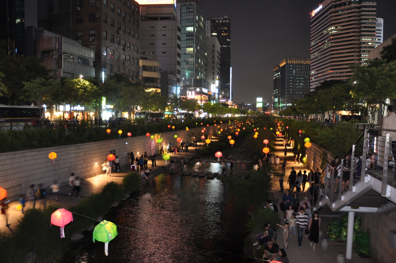 清渓川は結構距離あるので全部は歩いていませんが、夜はライトアップされていて付近は食事するお店も多いので食べた後に酔いさましがてら散歩に最適です。デートスポットでもあるので夜はカップルがたくさんですが気にせず歩きましょう(笑)