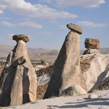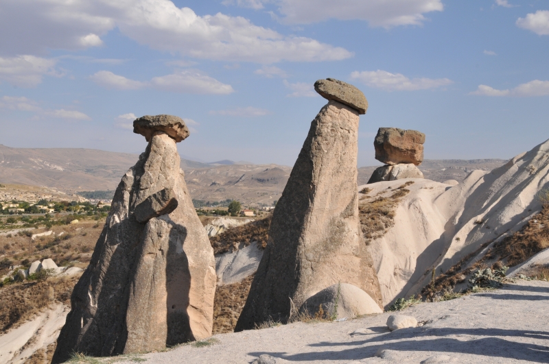 カッパドキアの奇岩の中でもこれは不思議です。並んで立つ3本の細い岩。しかも少し斜めになっています。真正面から眺めてもいいですが、近くにちょっとした岩山があり、そこを登ればカッパドキアの光景を堪能することができます。