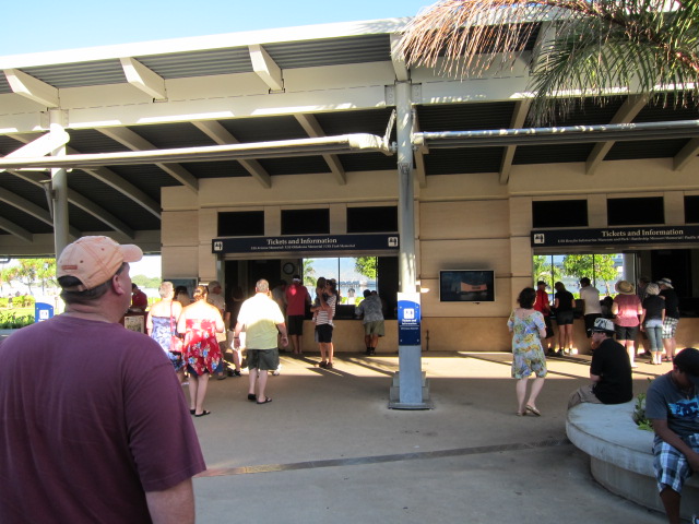 6、ここに入るときの手順、まずゲートに入る前に手荷物があると、係員に止められ、ゲート右手にある手荷物預所に行き手ぶらになる。すると、ゲートはすんなりパスできる。ゲートをパスすると、正面にある「Tickets and Informations」まで行きアリゾナ記念館行ボートの乗船時間の書かれた乗船券をもらう。で、乗船前に説明映画を見てから乗船。ゲートは何回出入りしても問題なし。待ち時間は、潜水艦ボーフィン号や園内兵器展示物、ミズーリ観光などで時間をつぶす。アリゾナ記念館は水ならば携帯可。