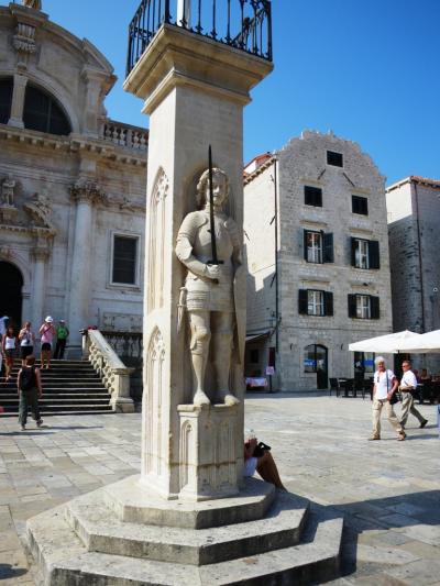 ドブロブニク旧市街のメインストリート「プラツァ通り」をしばらく歩くと、ルジャ広場に出ます。ちょうど夏季の繁忙期だったので、昼も夜も多くの人で賑わう広場でした。この広場では、広場の真ん中に立つ「ローラント像」をぜひチェックしてください!その昔、この像の右腕の肘から手首までの長さ51.2センチが、商取引の際に使う長さの基準だったそう...。