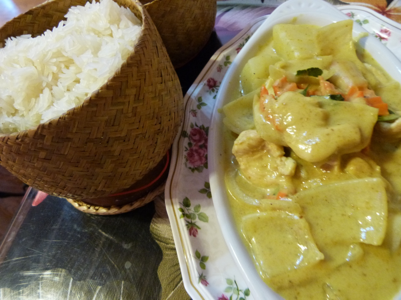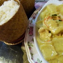 2品目は「イエローカレー(チキン)」と「スティッキーライス(もち米)」。辛さはミディアムでオーダー。これはなかなかいい線いってます。