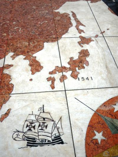 「ジェロニモス修道院」と「発見のモニュメント」の間に広がる広大な広場が「インペリオ広場」。多くの方はほとんど素通りですが、床面に描かれている絵やモザイク画がなかなかユニークです!中でも、大理石のモザイクで、世界地図と各地の発見年号が記されている絵は、なんだか歴史の教科書を見ているよう...。形は悪いですが、ちゃんと日本もありました!日本の横に書いてある、1541年は、ポルトガル船が豊後に漂着した年なんだとか。