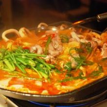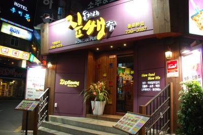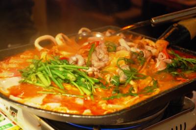 鍾路にあるフルーツマッコリで有名なお店です!情報番組やガイドブックなどでも紹介されるお店だそうですが、私達の場合、そんなことはまったく知らず、飛込みで入ったお店。中は、韓国の古民家風でいい雰囲気。テーブル毎に仕切りがあるのでゆっくりくつろげます。下戸で、かつ、マッコリが有名だとは全く知らなかったので、普通に食事を楽しみました。シャベル型の鉄板でのコチジャン炒めが名物のようなので、海鮮とぶたの入ったのをオーダー。オーナーらしきおじさんが、身振り手振りで精いっぱいサーブしてくれました。でも、このお料理、味は美味しいのですが、ハンパなく辛いっ!辛いのは得意なつもりの2人でしたが、これにはあえなく撃沈...。舌の感覚がなくなりました。