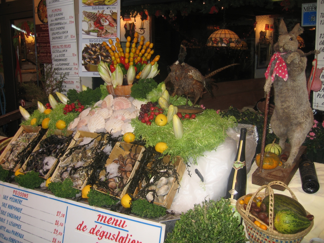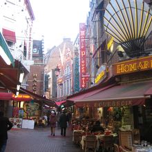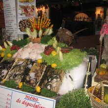 ここにはにぎやかな通り沿いに魚介類などを店頭に並べた