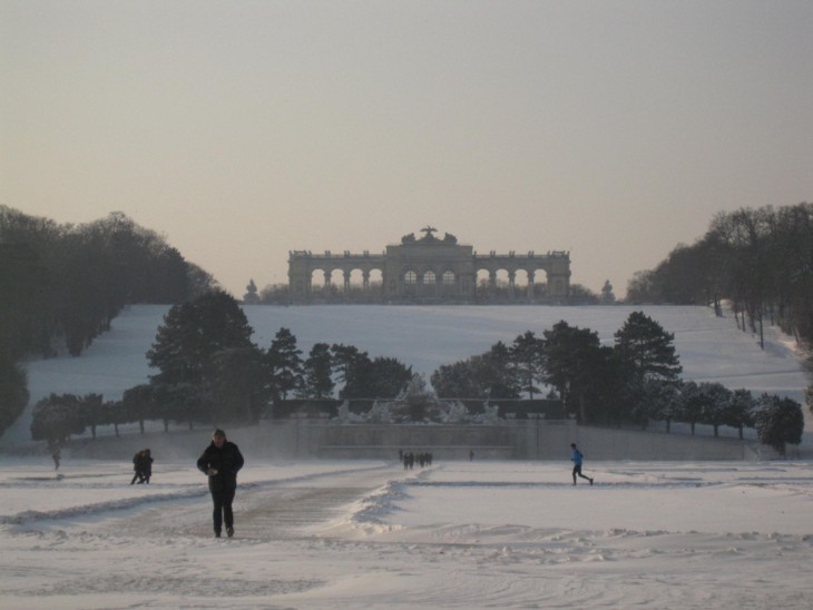 有名なマリアテレジアイエローの宮殿。宮殿の目の前に広い庭園があり、春や夏には芝生や花壇がきれいに整備されているようなのですが、冬だったので一面雪景色でした。その代わり、中庭?でクリスマスマーケットが開かれており、なかなか楽しかったです。庭園内で(雪が降り積もっているのにも係らず)割りと薄着で(笑)ジョギングしている現地の方を数名見かけました。現地の方のランニングスポットなのかな?
