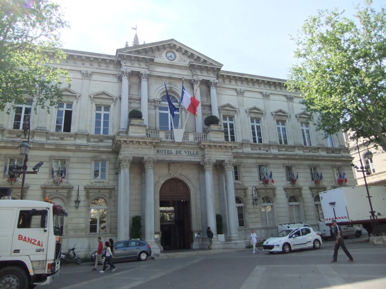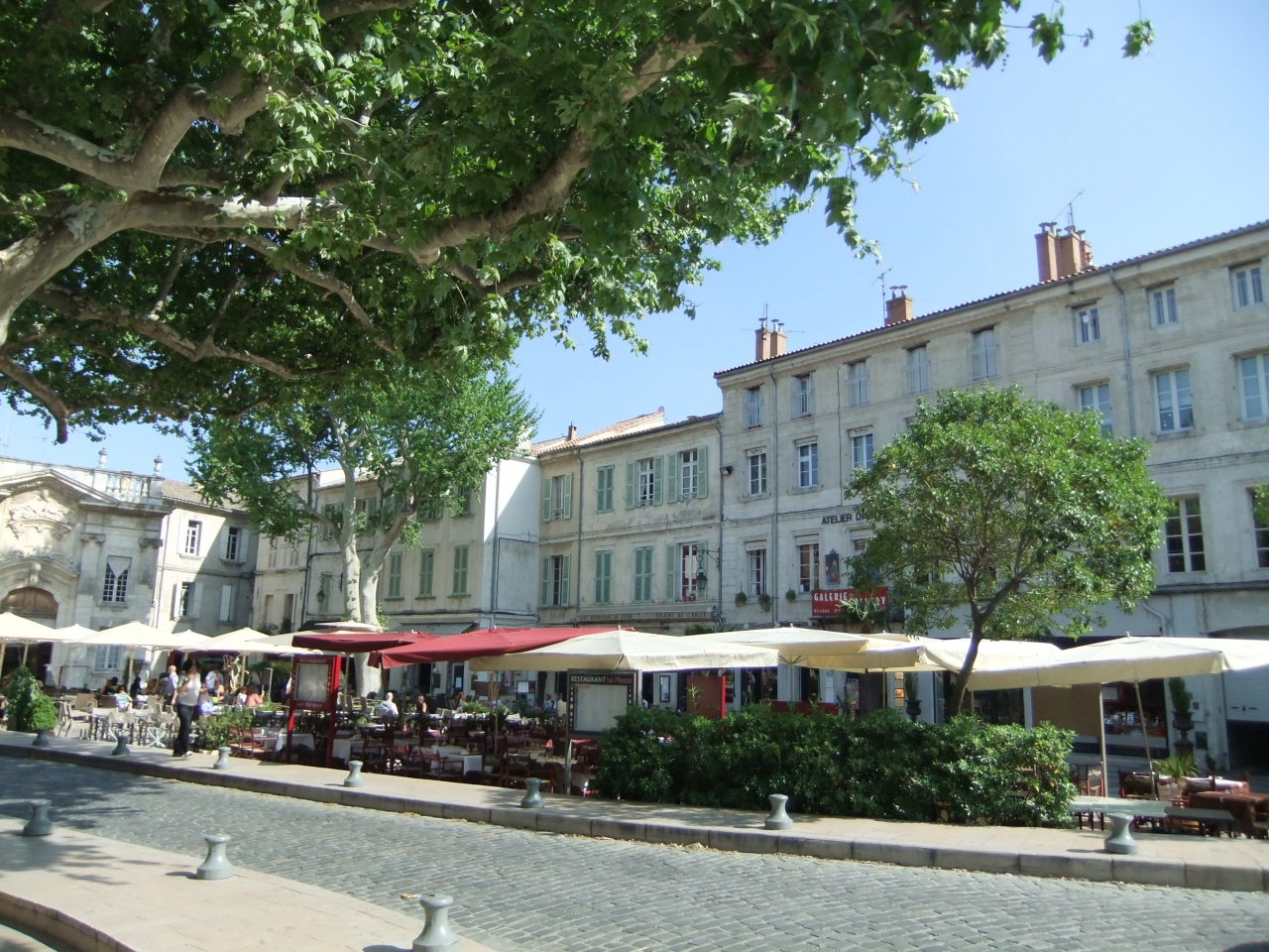 アヴィニョン駅からプラタナスの並木が涼しげなレピュブリック通りを法王庁に向かってまっすぐ行くと行き当たるのがアヴィニョン街の中心の時計台広場です。