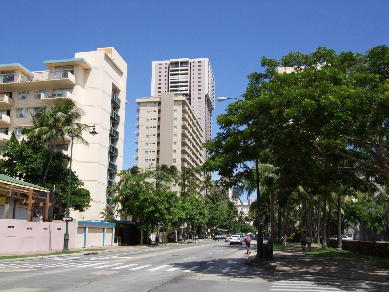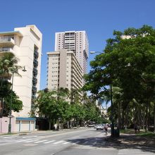 クヒオ通りは、カラカウア王の甥にあたるクヒオ王子から名前が付いたもの。ホノルルではカラカウア通りに次ぐ目抜き通りです。カラカウア通りの北側を平行して走ります。さらに北側にはアラワイ通りが走っていまして、カラカウア通りは、東への一方通行、アラワイ通りは西への一方通行。これに対して、クヒオ通りは、両方向に行けるので、バス通りになっているのだと思います。西の方は、ちょっと寂しいのですが、東に行くにしたがって、ホテルや飲食店が多くなって、賑やかな感じ。フードパントリーもこの通り沿いです。海岸には接していませんが、歩いて4~5分。近いです。