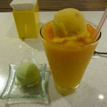 しばらく待つとイケメンの男の子がサービス品のメロンシャーベットと一緒に持ってきてくれました。