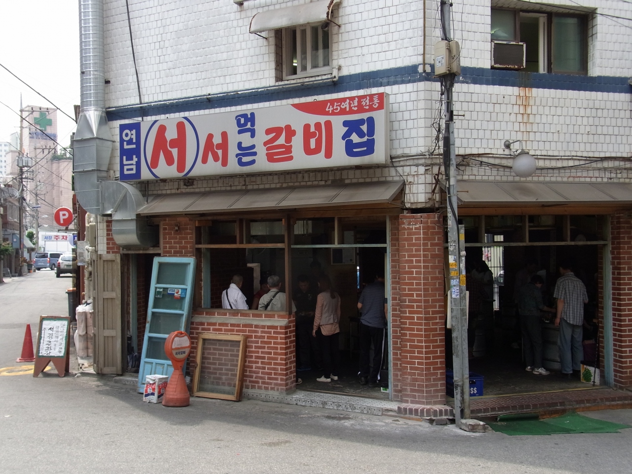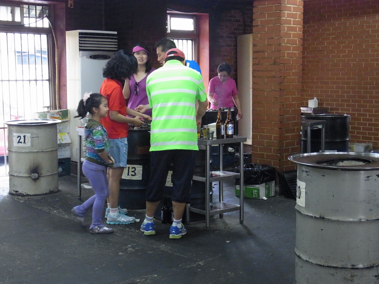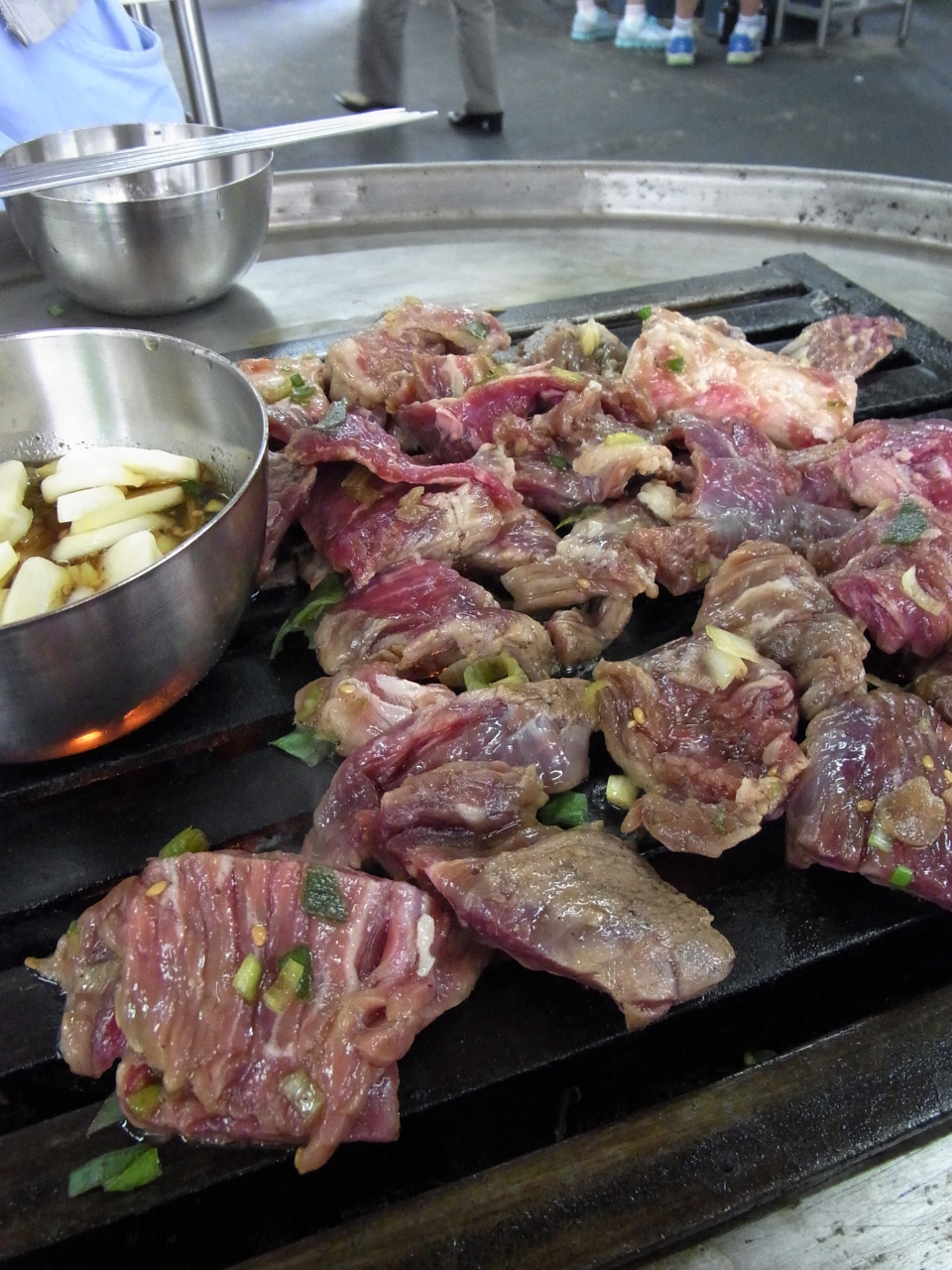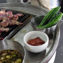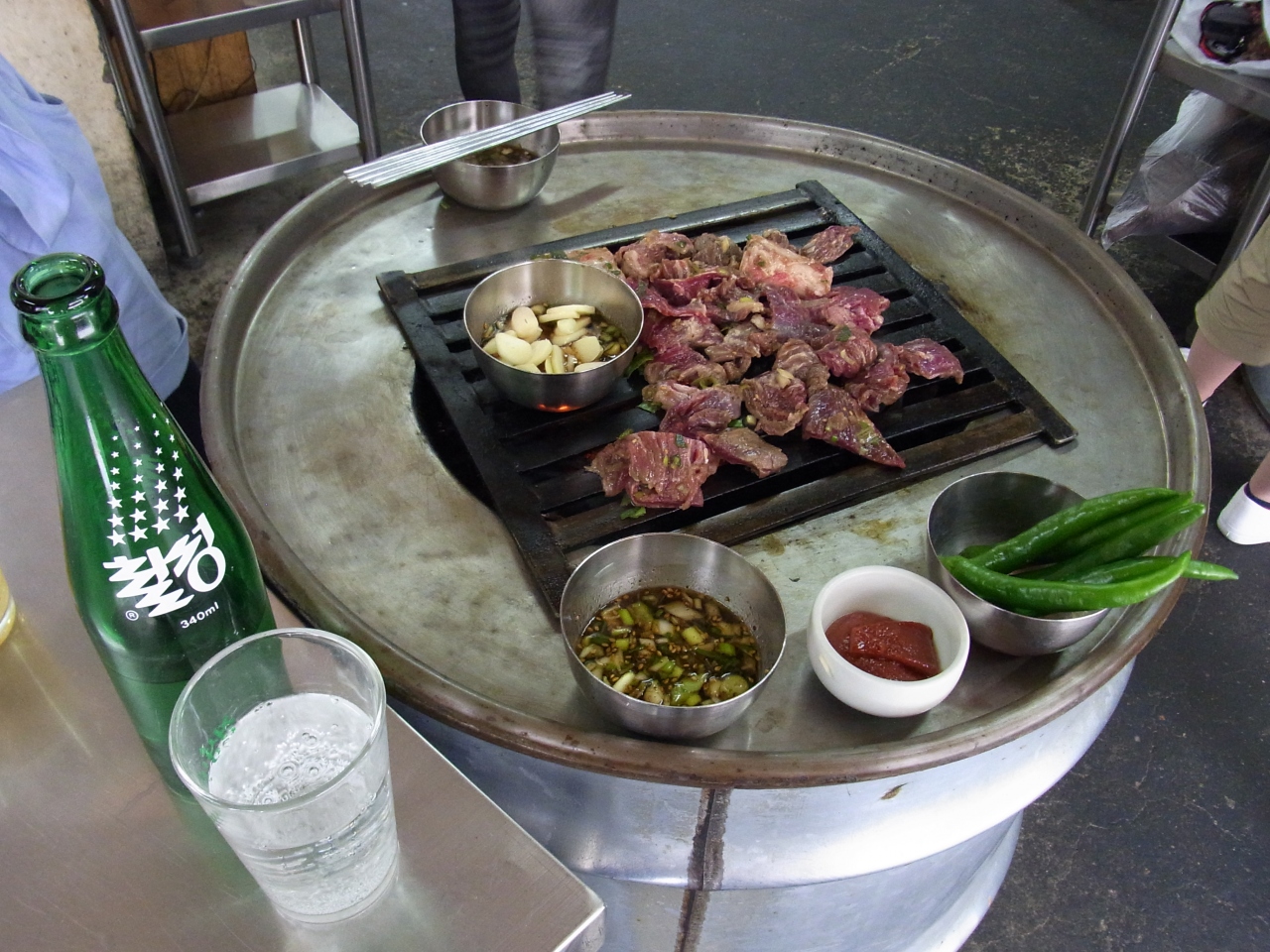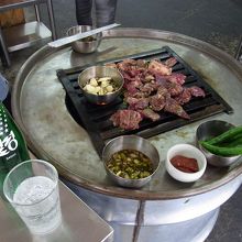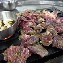 駅から少し歩きます。何も知らずに建物を見ると衝撃を受けるかもしれません(笑)林立するドラム缶のひとつに案内され、人数分のお肉が運ばれてきます。タレに漬け込んだ牛カルビは見るからに美味しそうです。一緒に出てくるトウガラシをつまみながら、焼けるのを待ちます。ニンニクの入った器も鉄板の上に載せて熱しておきます。