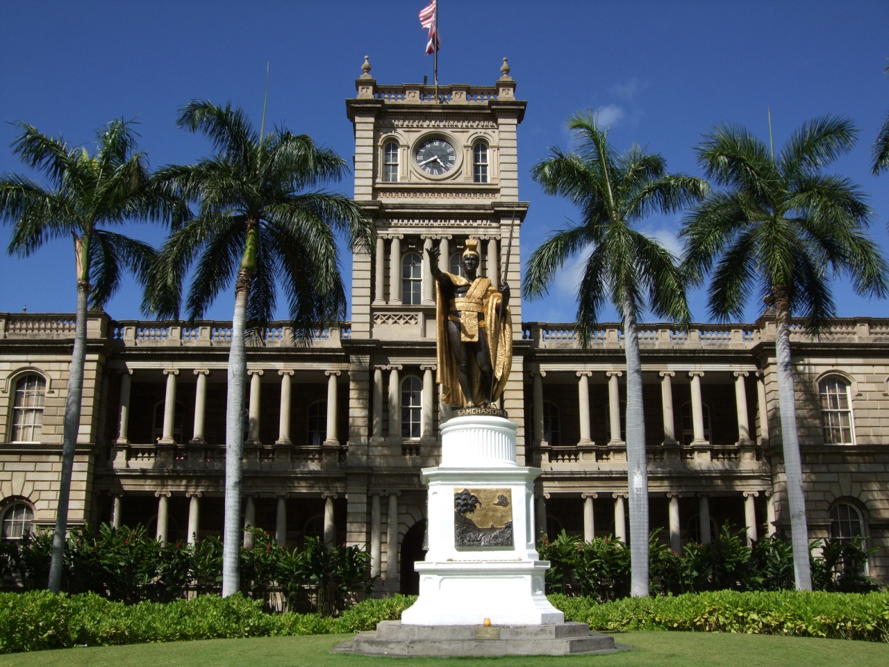 カメハメハ大王像は、ハワイでも一番有名なスポットでしょう。ハワイ空港から、ザバスでワイキキに向かったのですが、いきなり、この像の前をバスが通ったので、あっさり初対面でしたが、ワイキキ方面から同じ20番のバスで向かうとこのキングス通りは通りません。運転手さんに降りる場所を聞いておくのがいいようです。さて、バックの古い建物は、アリ・イオラニと呼ばれる旧裁判所。この組み合わせがはまりますね。像の建つ芝生内は立ち入り禁止。アップの写真はデジカメでは撮れません。ちなみに、この像はパリで造られ、2体目。オリジナルは大王の生誕の地、ハワイ島北部のカパアウの町に建っているそうです。