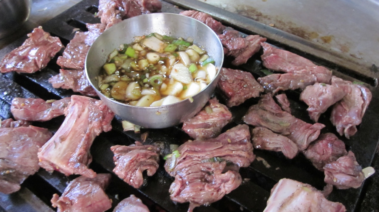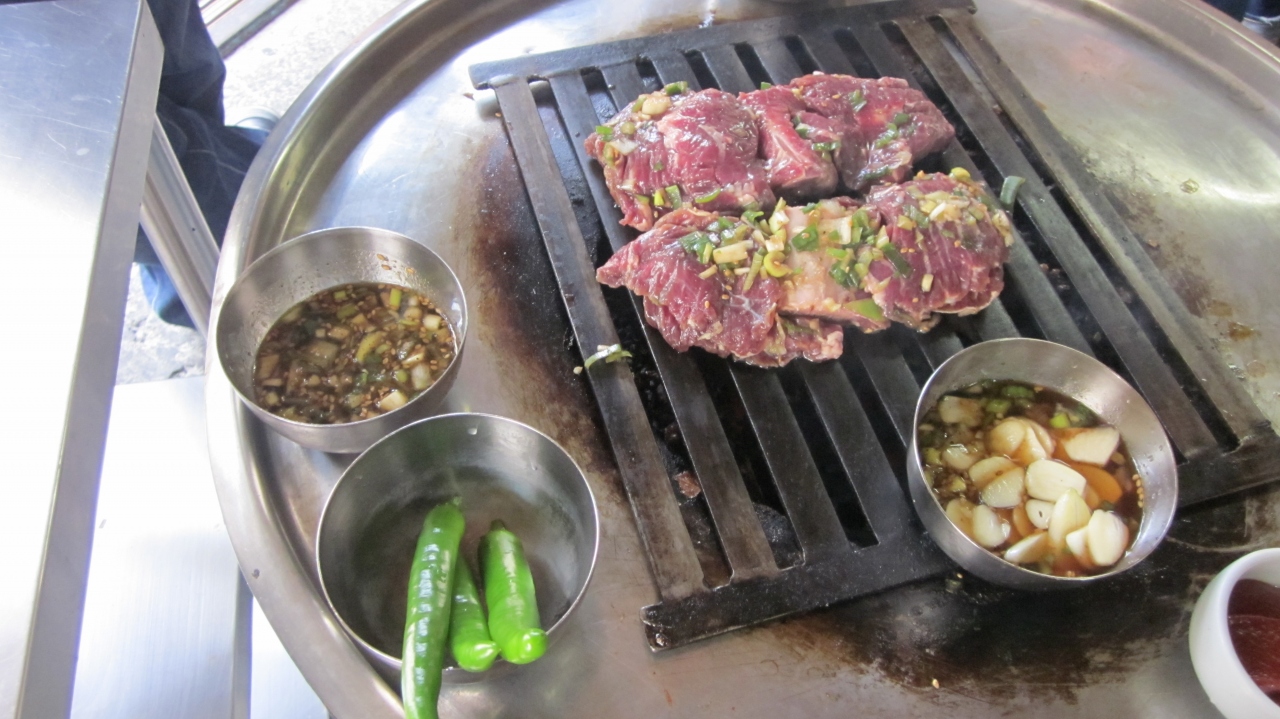 地下鉄新村駅から徒歩5分。こんなとこにあるの~?っていう感じ。横断歩道を渡って、急な坂を上った右手にあります。窓や扉が全開なので、すぐわかります。そう、ドラム缶の周りに皆さんたって召し上がっておられます。地元の方で混んでいるので、時間帯を考えて行った方がよさそうです。日曜日14時ごろ行きました。2組目ですぐ案内してもらえました。大人2人で伺い、カルビ2人前+コーラ+追加カルビ1人前で計45000wでした。たいそう、おいしゅう頂きました。ご馳走様でした。