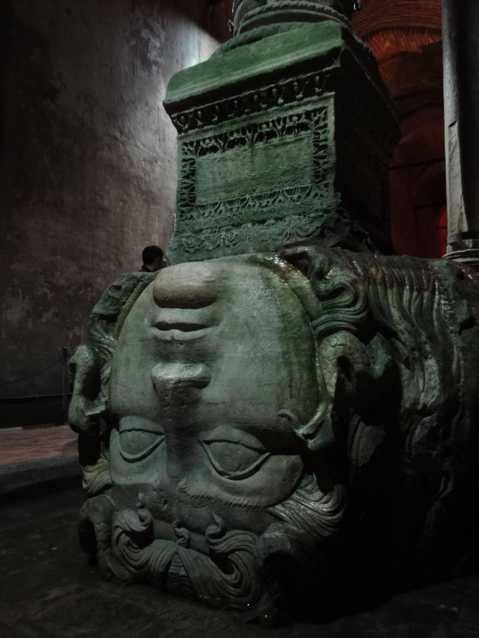 赤い光に照らされた柱がいくつも連なりとても幻想的な空間です。貯水池だった場所なので足元には現在も水が広がっており、魚もたくさん泳いでいます。奥のほうへ進むと柱の土台に大きなメデューサの顔が使われている場所があるんですが、顔の向きがめちゃくちゃに置かれています。ガイドさん曰く、これは柱の高さ調節のために適当に置いたので、向きは関係なかったとのことですが、この顔の向きに関しては諸説あるそうですよ。