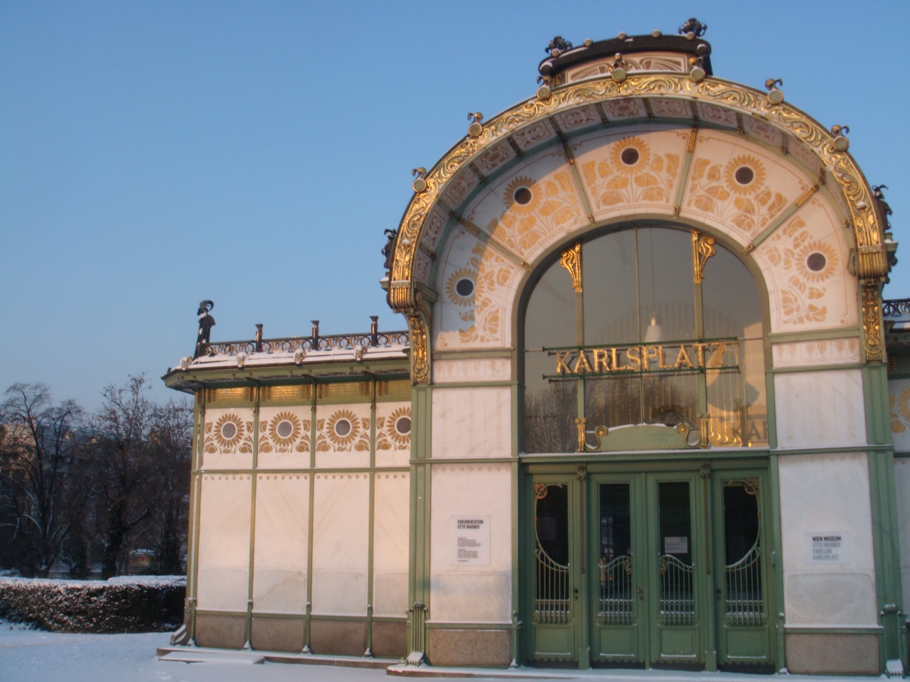 美しい素敵な駅舎です。カールス教会もそうですが、緑色の部分がさわやかで美しかったです。また、金色も豪華なかんじがしていいですね。この独特な形をした駅舎は、一度見たら、なかなか忘れられないと思います。街の中を歩いているとかんじられますが、ウィーンは本当に芸術の街ですね。模様がさりげなくアールヌーヴォー調かもしれません。