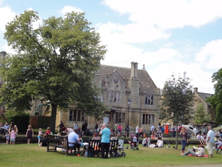 街の中心を小川が流れており、その周りにはお土産屋さんやレストランなどの店舗がたくさん立ち並んでいます。人工の小川なので水深が浅く、子供たちが遊ぶにはちょうどよい感じで、小川脇の芝生にシートを広げて家族みんなでピクニックをしている姿がたくさん見られました。真夏の日本の海水浴場ばりにたくさんの人がいました(笑)