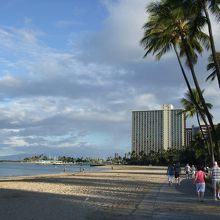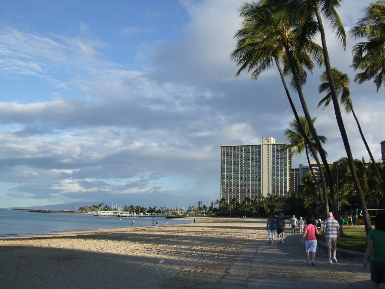 フォートデロシー公園は、クヒオ通りの西の端。カラカウア通りと一緒になるあたりから始まって、海岸に向けて広がる公園です。公園は遊歩道がいくつかあるのですが、街中から海に向かって、どんどん歩いていくと、そのまま海岸につながっています。後で、地図で見ると、そのあたりは、「フォートデロシービーチ」となっていました。ワイキキビーチは、砂浜に沿った遊歩道はないのですが、「フォートデロシービーチ」は水辺を歩く遊歩道があって、朝の散歩にはもってこい。大勢の観光客が歩いていました。