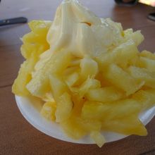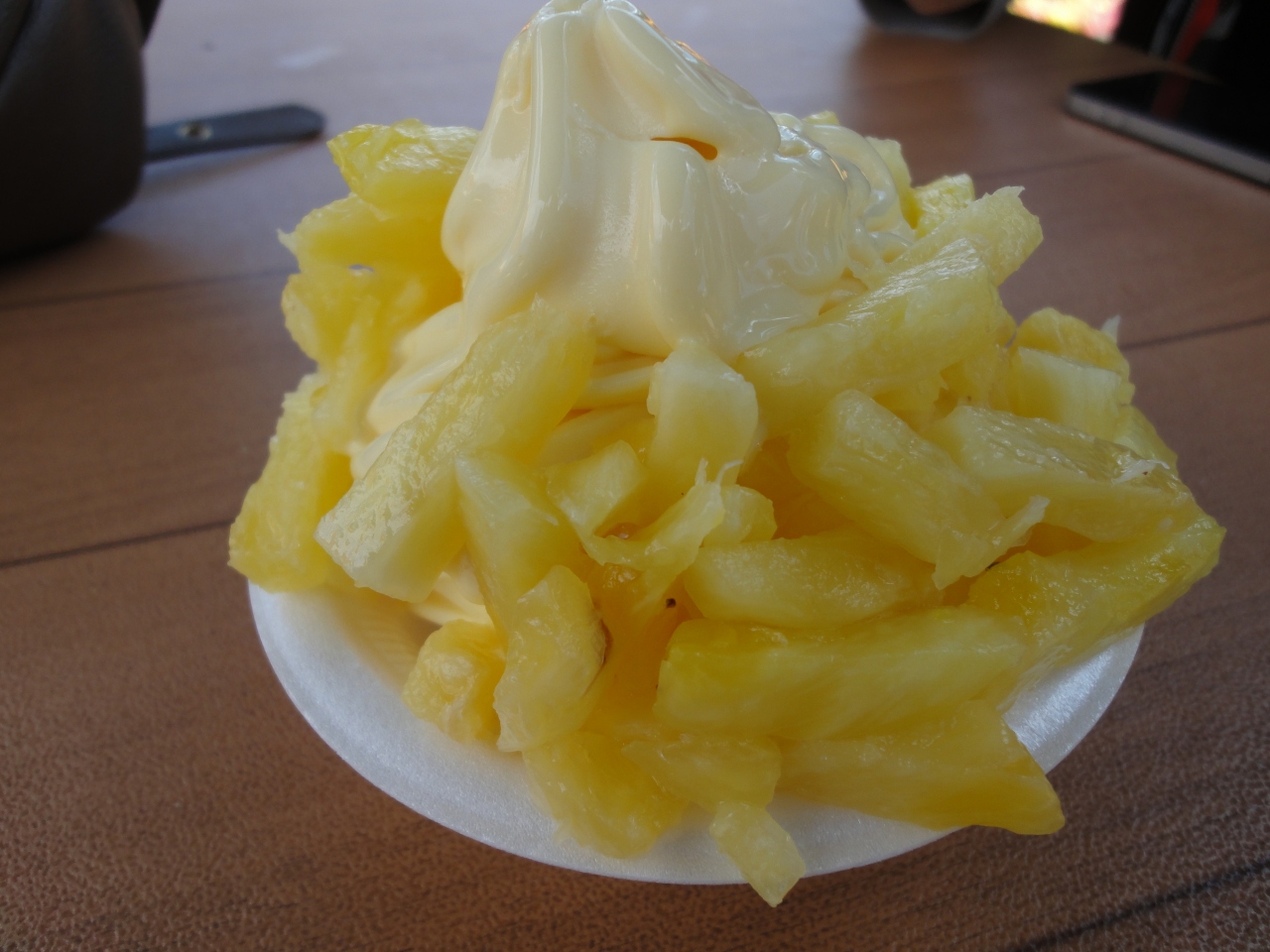ぜひパイナップルソフトクリームを食べてくだい。パインの果肉もたっぷり乗っています。