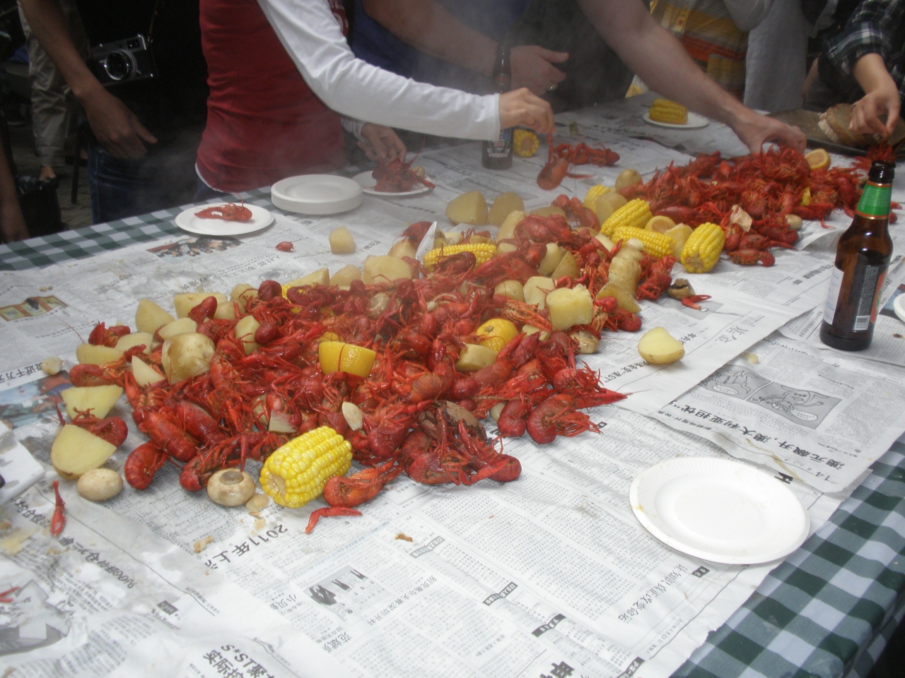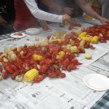 上海の郊外、古北地区の住宅地です。市中心部に比べると環境がいいので日本人が比較的多く住んでいます。日本人学校や、総領事館もあります。マッサージ屋さんもたくさんあります。レストランのテラスで、ざりがにパーティーがありました。上海の夏の風物詩です。
