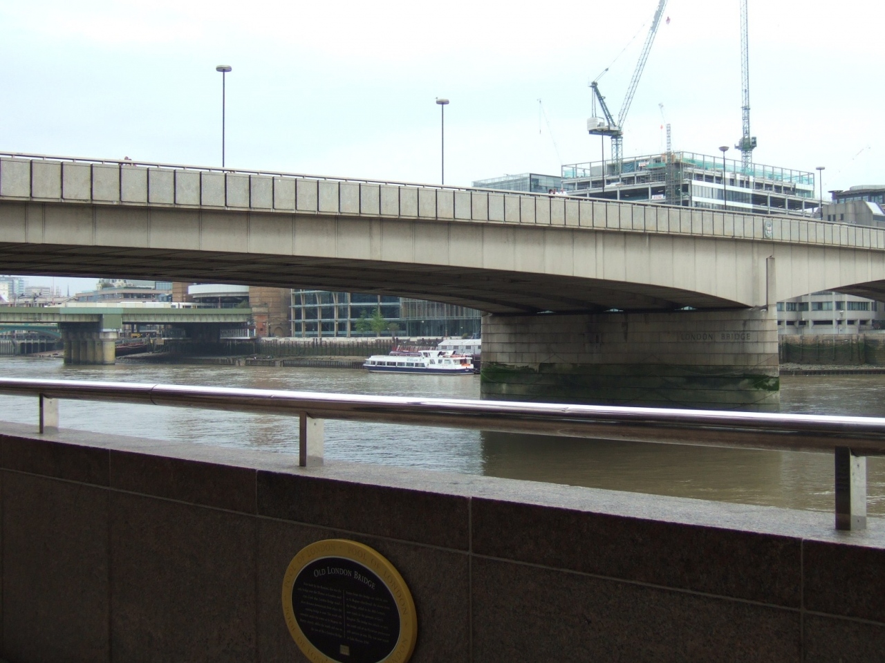 テムズ河の南河岸に沿って、ミレニアム橋から散歩しているとロンドン橋とロンドンブリッジ駅に着きました。ロンドン橋と聞くと♪ロンドン橋落ちたー落ちたー♪とすぐに口づさんでしまうほど、有名な橋ですが、この橋はテムズ河のタワーブリッジの上流にある橋で、歌にあるように何度も落ちては作り直すことを繰り返してきたそうです。現在の橋はコンクリートでできており、見た目はごく普通の橋でした。橋のたもとには、[POOL OF LONDON]のプレートがあり、ロンドン橋の歴史が記されていました。