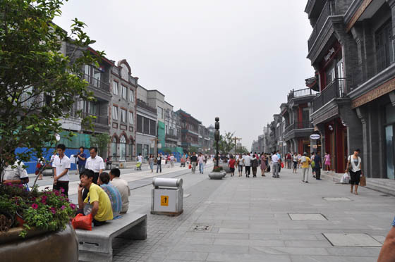 前門大街はけっしてテーマパークではない。れっきとした商店街として機能しているからである。前門大街は,表通りに古い街並みの建物を並べているが,一歩裏通りに入ると,崩れかけた建物も混在し,北京の古い住宅街が広がる。再開発はまずは表通りからということだろう。表通りとのギャップが顕著だ。前門大街の表通りは,北は前門から始まり,南は珠市口西大街まで約1km続く。途中脇道が西に出ていて,そこも約1km続く。フロリダにあるディズニーの映画スタジオのように張りぼての街ではなく,建物ひとつひとつに店がはいっていて,営業しているところが,テーマパークとは違う。商店街のある通りをギリシャの街並みにしてしまった東急東横線の大倉山と似ている。通りの幅は広く,自動車は侵入できない。