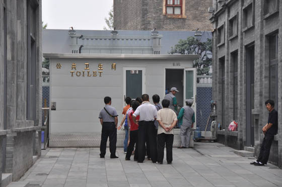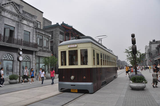 道路の中央を,当時を模した路面電車が走っている(南北に約800m)。が,架線がないところを見ると,バッテリー(蓄電池)で走る電車だろう。電気自動車としくみは同じである。電車の外壁の部分はまるで絵に描いて貼ってあるような安普請な造りである。それでも立派に人を乗せて運ぶことができ,通りの南北を折り返し運転している。電車が近付いてくると,写真を撮ろうとデジカメを構える人間が後を絶たないが,いかにも轢かれそうで危ない。カメラに収めるほど,古き良き電車には見えないが,北京には現在このような電車は走っていないので,物珍しいこともあるだろう。地下鉄2号線の前門駅を降りてすぐ南側に広がる街なのでアクセスはしやすい。100年前の街並みが見たければぜひ行ってみるのもよいかも(ただし街自体は偽造である)。