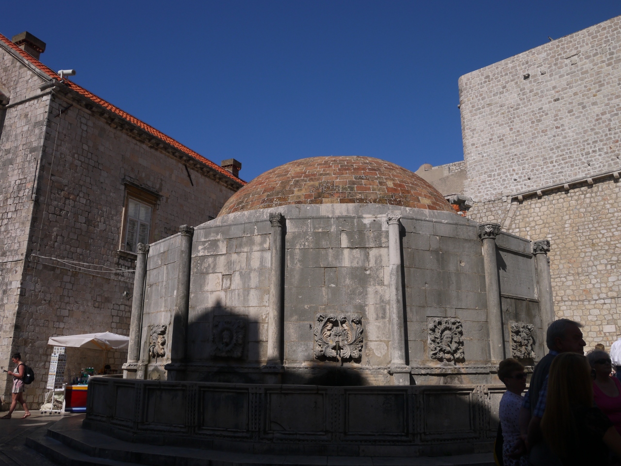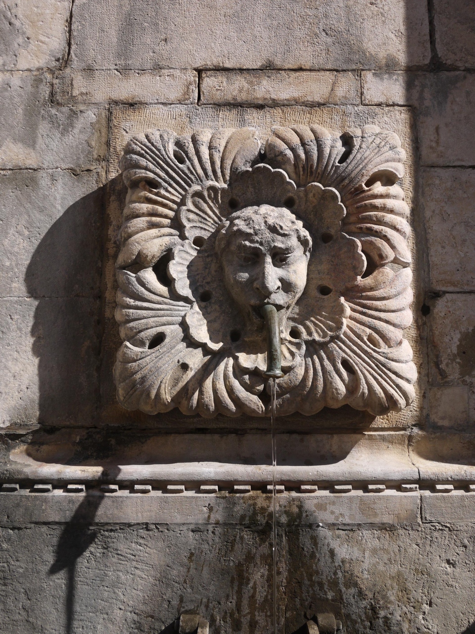 ピレ門入ってすぐ、プラッツァ大通りの端にある噴水です。噴水と言っても水が吹き上げているわけではなく、人面のレリーフの口から蛇口のように水が出ているというものです。人面レリーフは何面かありますが、水が出ているのは数面でした。