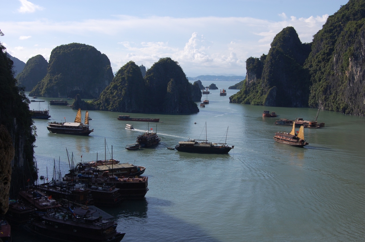 中国の桂林の海バージョンです。なんとも奇怪な岩山があちらこちらに点在します。首都ハノイからの日帰りツアーがかなりありますが、子kは是非一泊する事をオススメします。なぜならば、夕焼けと朝日がとてもすばらしく、これを見ずしてこの地のよさ輪語れないと思うからです。船内では、昼食、夕食、朝食が付いて、更に帰り道に昼食も付きます。