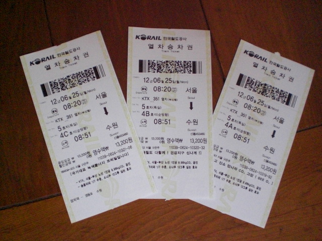 予約は事前にhttp://info.korail.com/2007/eng/eng_index.jspで予約して、前日にソウル駅の2Fにある窓口で引き換えておきました。