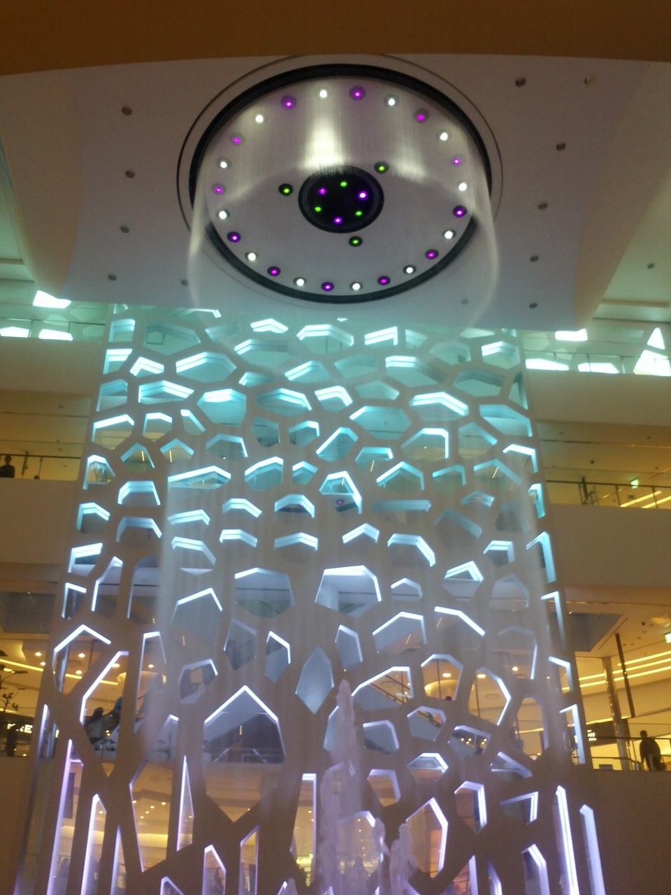 アクアモールの吹き抜けの水のショーは毎時ちょうどに始まります。