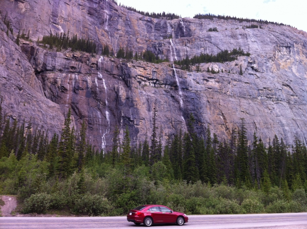 看板も案内も何もないので見逃す可能性があります。Icefield Parkway上でColombia Icefieldから30分ほど運転していたら左手に見えてきます。車が止めれるようにいくらかスペースが設けてあるので注意していればわかります。