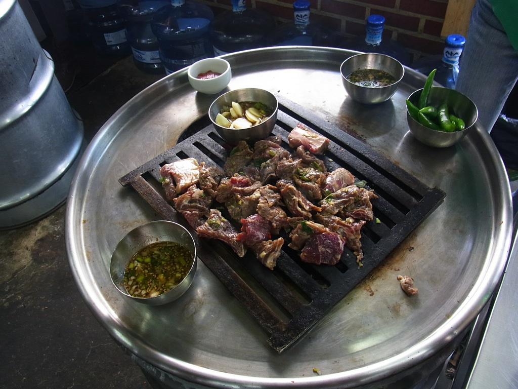 メニューは牛カルビのみ!14000wでした。お店に入って、ドラム缶の前に立ってドリンクを頼むとドリンクと牛カルビ人数分がどーんと置かれます。ちなみにお水はセルフです。ここも混んでるとうわさだったので、14時くらいに行きましたが、そんな時間でもアジョシやアジュマたちがスル片手に飲んで食べてる!でも味は本当においしいです~。ちょっと甘めのたれも最高!いろいろ動き回って足が痛いのに、立ちっていうのがキツイときもありますが、行く価値はありです!