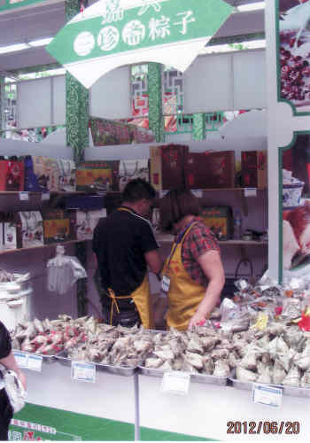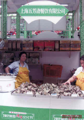 三大年中行事とは、春節と、端午の節句、中秋節です。今年の端午の節句は12年6月23日、日本の5月5日とは一ヶ月半もズレています。今年は22日(金)23日(土)24日(日)の三連休、子供の成長を祝う行事です。お世話になった人に粽を贈る風習もあります。端午の節句ではまず粽子を食べます。上海の粽子はもち米に醤油ベースで味付けをして、中に豚肉とその脂身をいれて作る。包む材料としてはアシの葉っぱが用いられる。しっかりと詰め込んだ後は、紐でしっかりと縛る。鍋にいれて長時間煮詰める。他に菖蒲を飾る、(日本は菖蒲湯。)竜船レース(日本はドラゴンレース)。生薬の香り袋などがあります。今日は豫園で端午の節句を味わって見ましょう。中でも人気は五芳斎と朱家角阿婆だと教えてくれました。