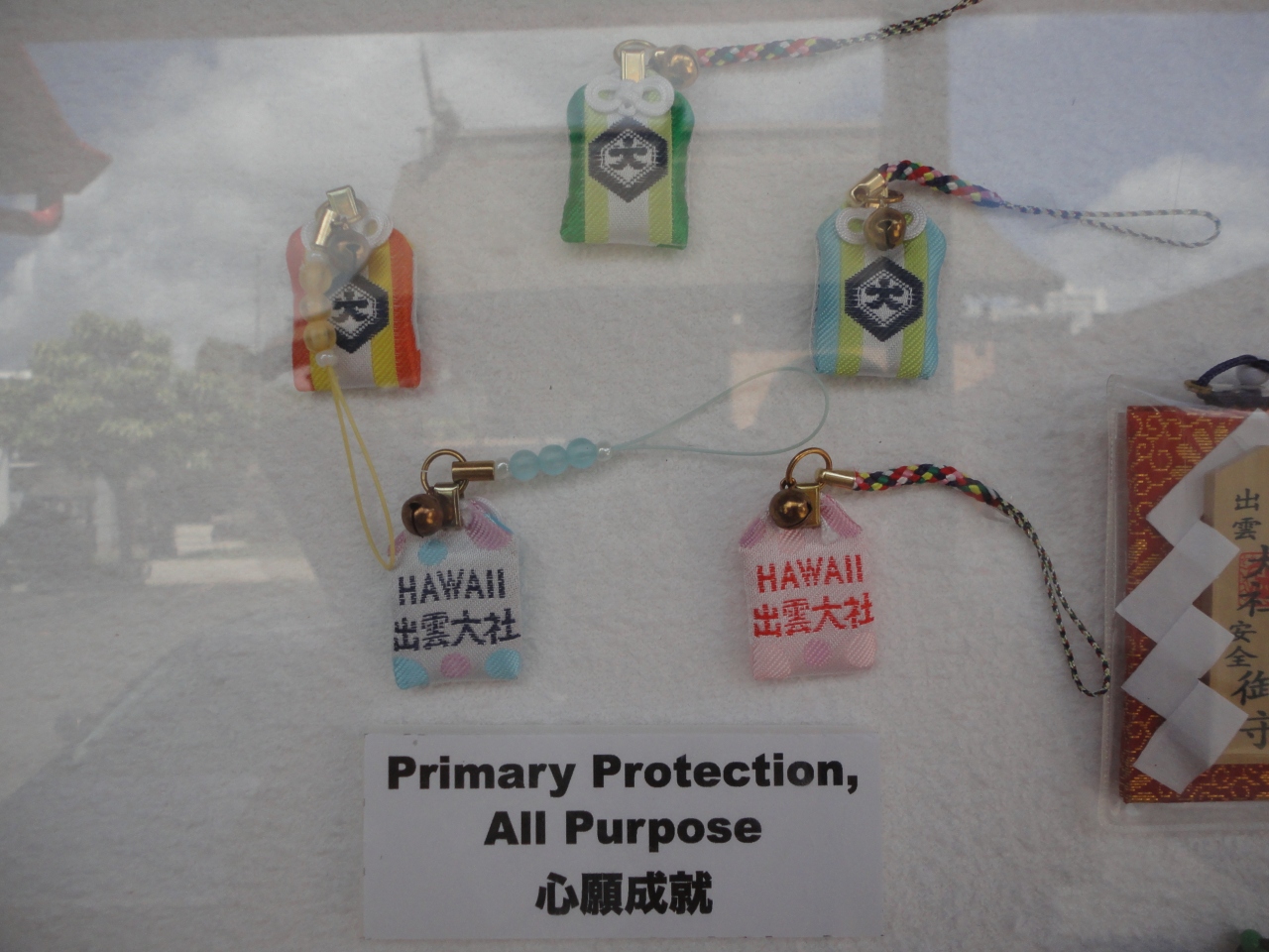 本家出雲大社のお守りもある。ハワイ出雲大社のでは、心願成就、交通安全以外にも、子ども、学業、旅行、ペット、ビジネス、恋愛ラブ、幸福、スポーツ、マラソンなどのお守りもあった。