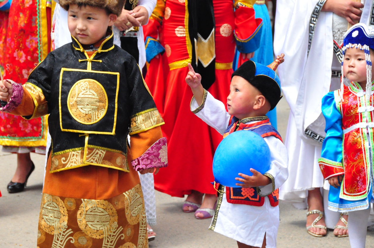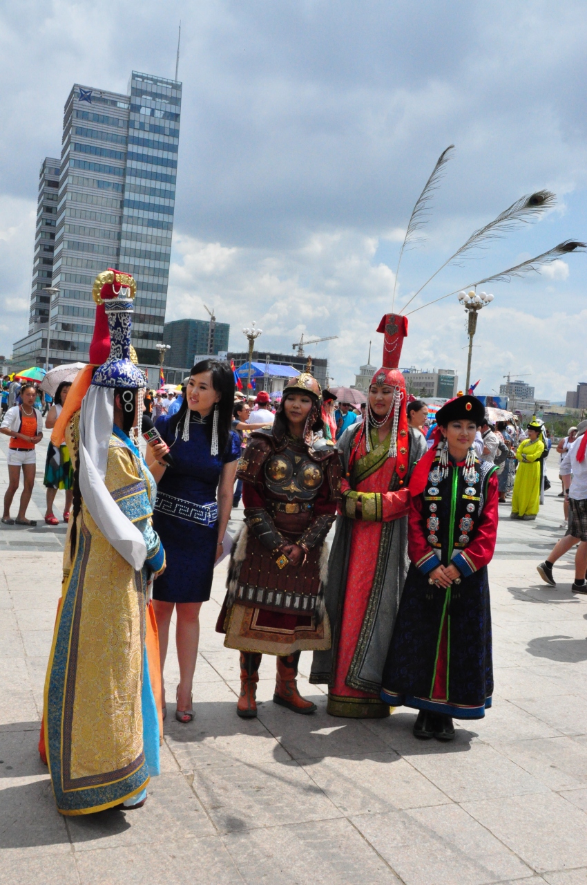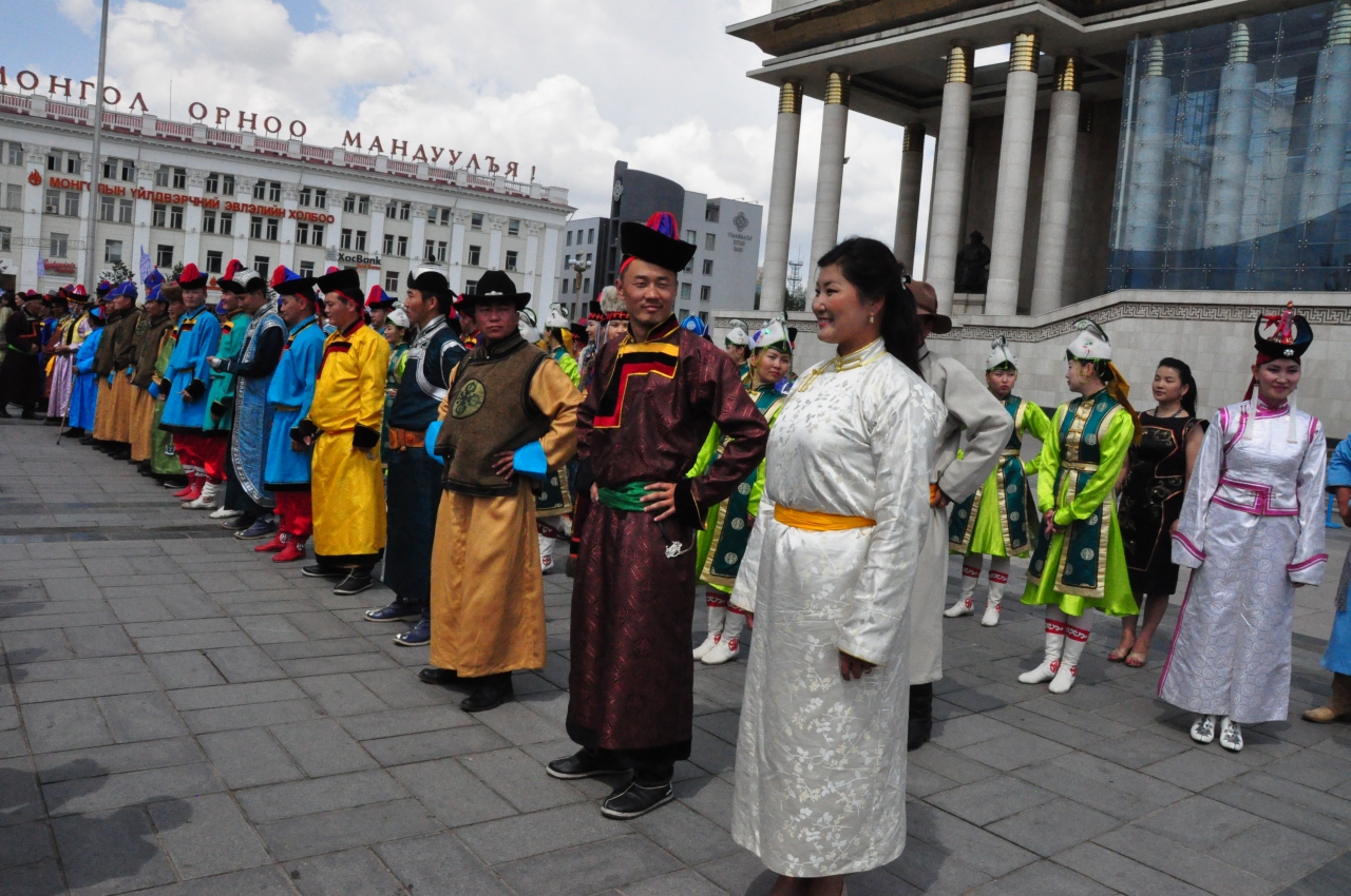 ナーダム祭の翌々日、市内ツアーの一環で訪れたところ民族衣装のフェスティバルが行われていてパレードしていました。