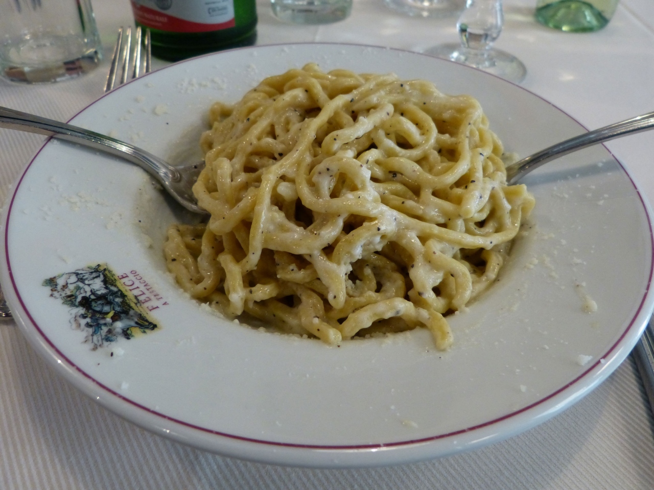 そこへ別の(専任?)カメリエーレが現れて豪快にあえてくれます。するとアラ不思議!麺が粉チーズをまとって一気にクリーミイに変化するんです。味はこってりと濃厚、ハウスワインのしゃばしゃばフラスカーティが良く合います。