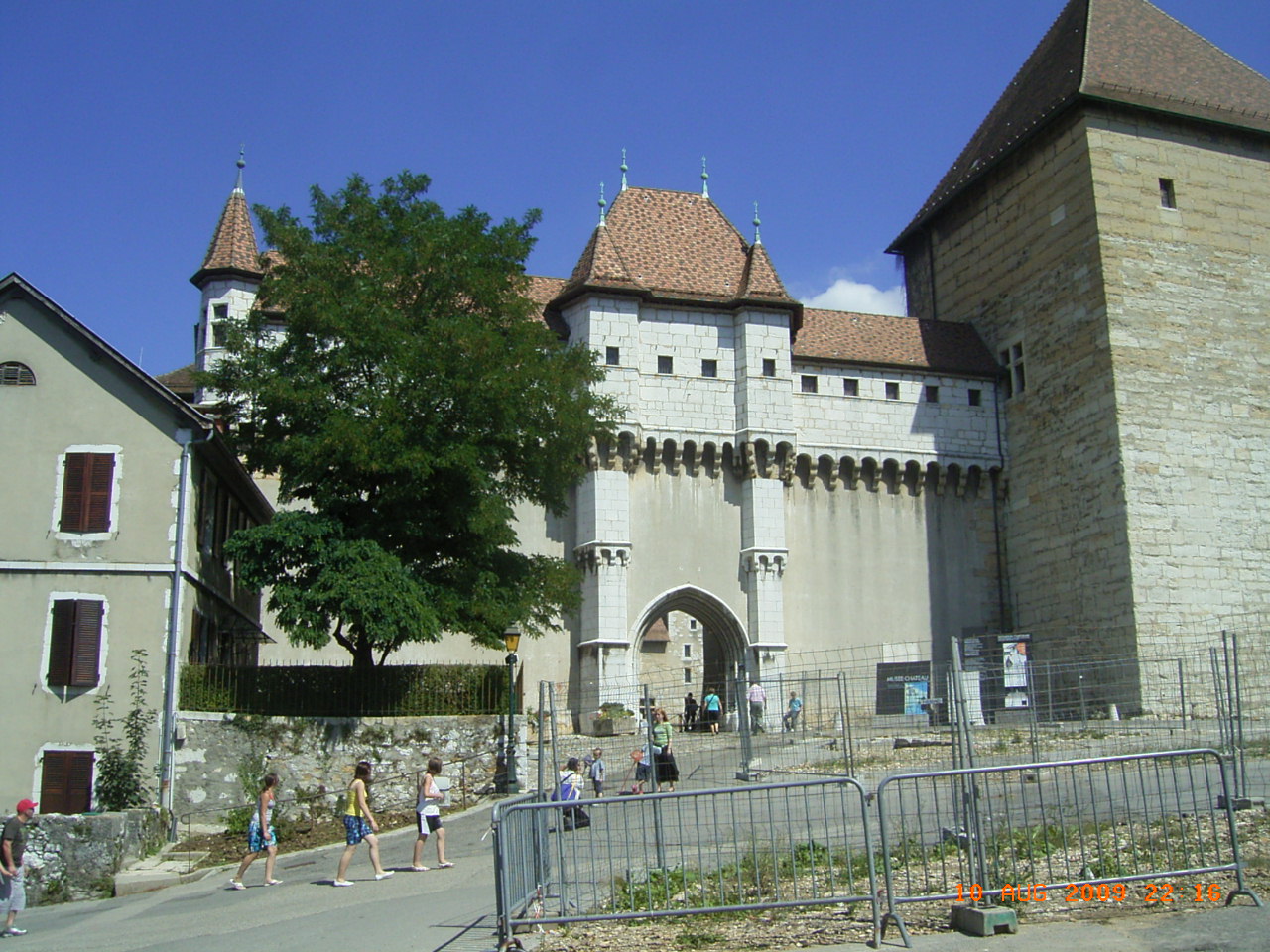 アヌシー城は旧市街地の小高い丘にあります。周りの民家はかわいらしいです。丘をのぼりつくと城門が現れます。高い城壁と強固な城門の中には素敵な王宮があります。ここからアヌシー湖の展望が素晴らしいのです。城ですが眺めはホッとします。