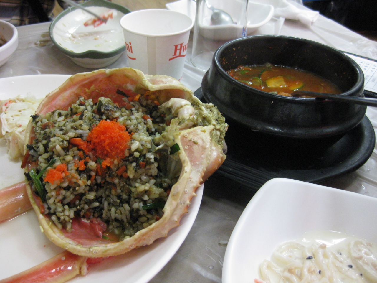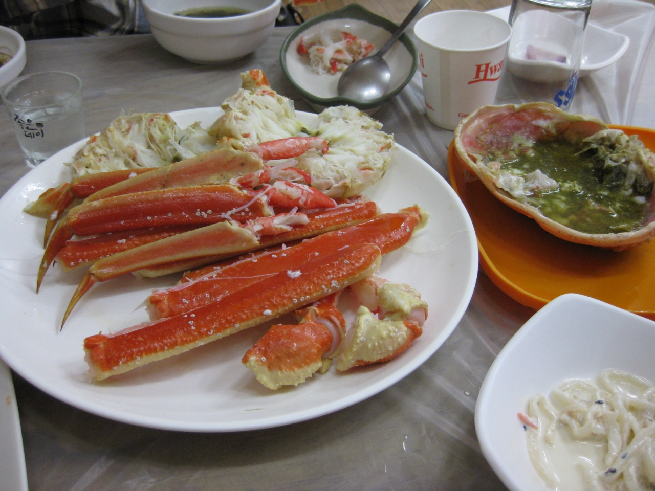 初めてキジャンシジャンでカニを食べてきました。ヘウンデからバスに乗って、30分強。現地の方で満席で、立ちっぱなしでしたが、テンションあがってたのでケンチャナヨ。値段交渉して、一番大きなタラバ蟹をゲット。いろんなおかず、焼酎とビールを一本ずつ、蟹味噌チャーハンで約5千円。安いと思いますよ。帰りは、ナンポドンまで座席バス(ちょっと座席が広くて、快速)で帰りました。