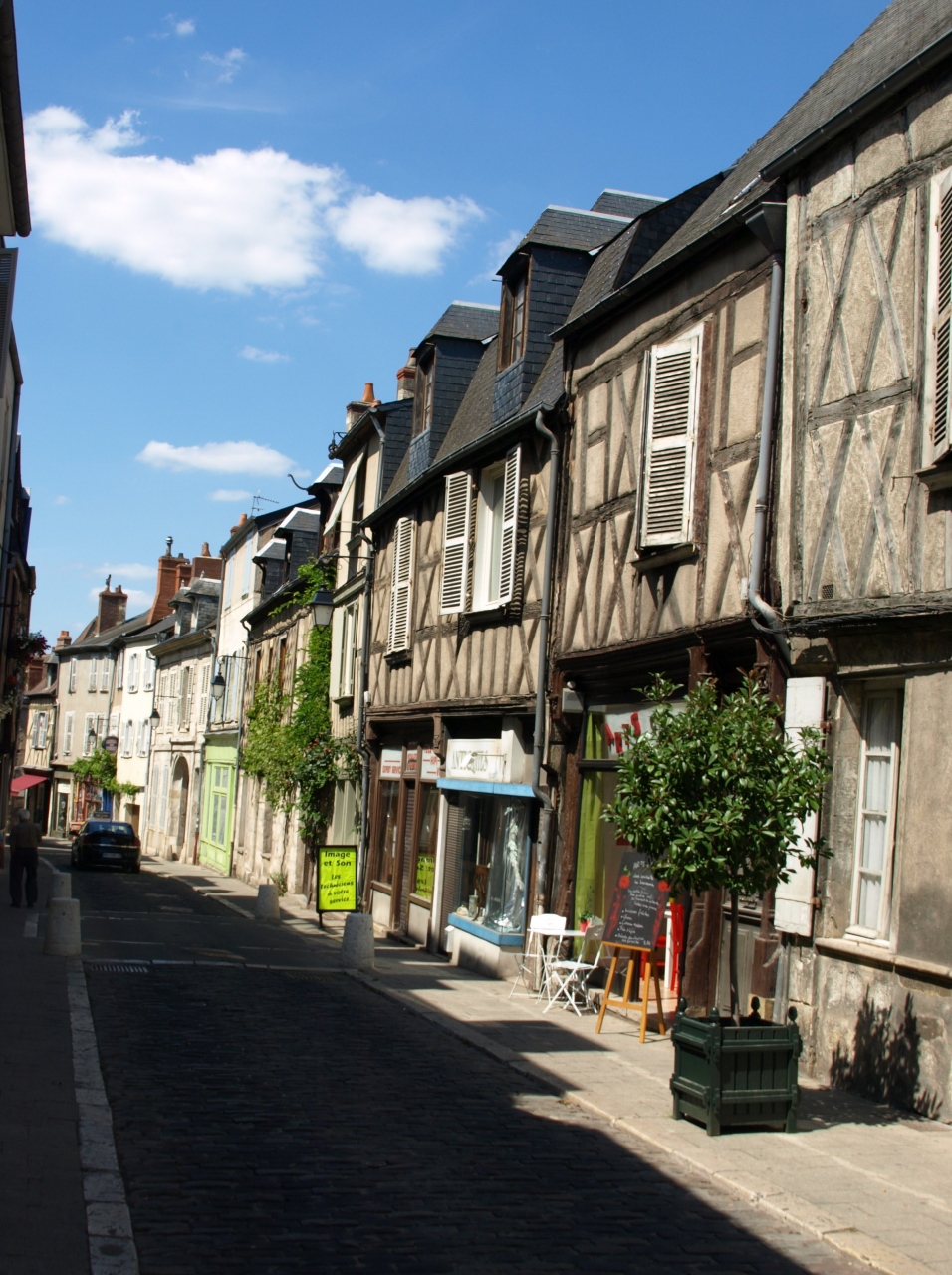 ブールジュの街は世界遺産であるサンテティエンヌ大聖堂Cathedrale St-Etienneで有名ですが、それ以外にも中世の街並みが残る見どころの多い街です。特に保存状態が良い地区が、大聖堂の北東の角から北に延びるブルボヌー通りRue Bourbonnoux沿いで、15世紀に建てられた木骨組みの家々が並んでいます。歴史的建造物であるこれらの建物は古本屋やブティック、バイオリンの工房、レストランなどに利用されています。アルザスの木骨組みの街並みほどカラフルではありませんが、これはこれで、ずっしり歴史を感じる通りでした。