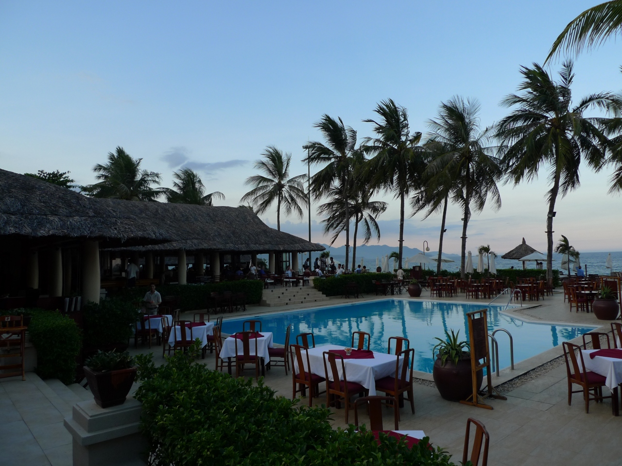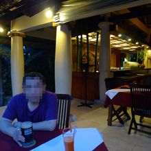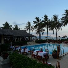 時間が早く空いているので席は選び放題。ビーチに近すぎたら風が強いかもしれないので、プールと海が見える席にした。