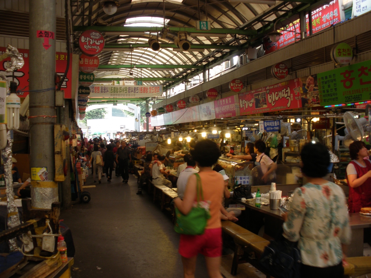 広蔵市場には衣料品や韓服、寝具、野菜、精肉、鮮魚などの様々な店が入っていた。うまいもん通りで屋台フードを食べられるが見たところ衛生的にどうだろうと思い今回はやめた。ほとんどが地元民で早くからまっこりで盛り上がっていた。非常に活気がある市場だった。
